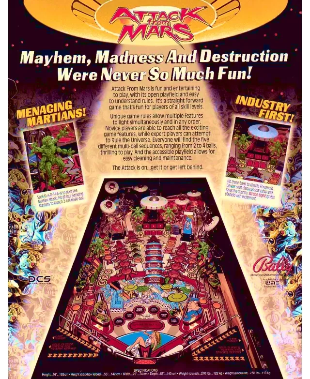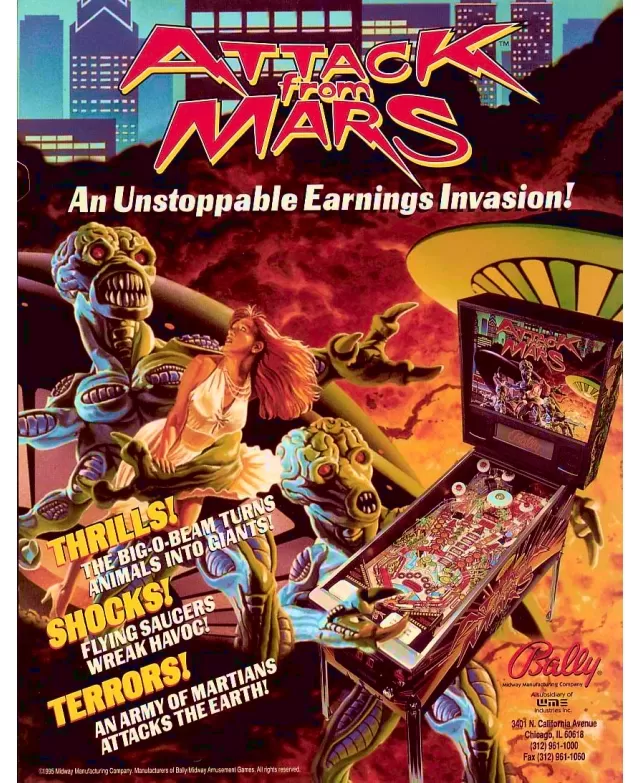 Le flipper Bally Attack From Mars est l’un des plus réputés et des plus reconnus des amateurs de flippers. Ce dernier a participé aux dernières heures de gloires des cafés à la fin des années 90. Présent en France à partir de 1996, ce flipper est à l’image du film : drôle, amusant et évidemment, il faut sauver la Terre des extra-terrestres !